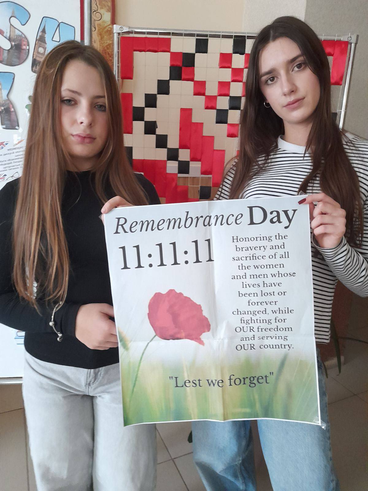 Учні 11 класу знайомилися з традиціями святкування Дня пам'яті, який відзначають 11 листопада у Великій Британії та країнах Співдружності, вшановуючи загиблих воїнів у Першій та Другій світових війнах та збройних конфліктах. Вони читали вірш “На полях Фландрії”, підписували листівки подяки. Це свято близьке нам, українцям, оскільки його символом є мак, який в українській історії означає пам'ять про тих , хто віддав своє життя за свободу та незалежність. Також одинадцятикласники поділилися своїми планами на майбутнє, де, на їхню думку, англійська мова відіграватиме важливе значення. Вони кажуть: “YES to ”, — та продовжують працювати над мовою, плануючи поєднати її з майбутньою професією.