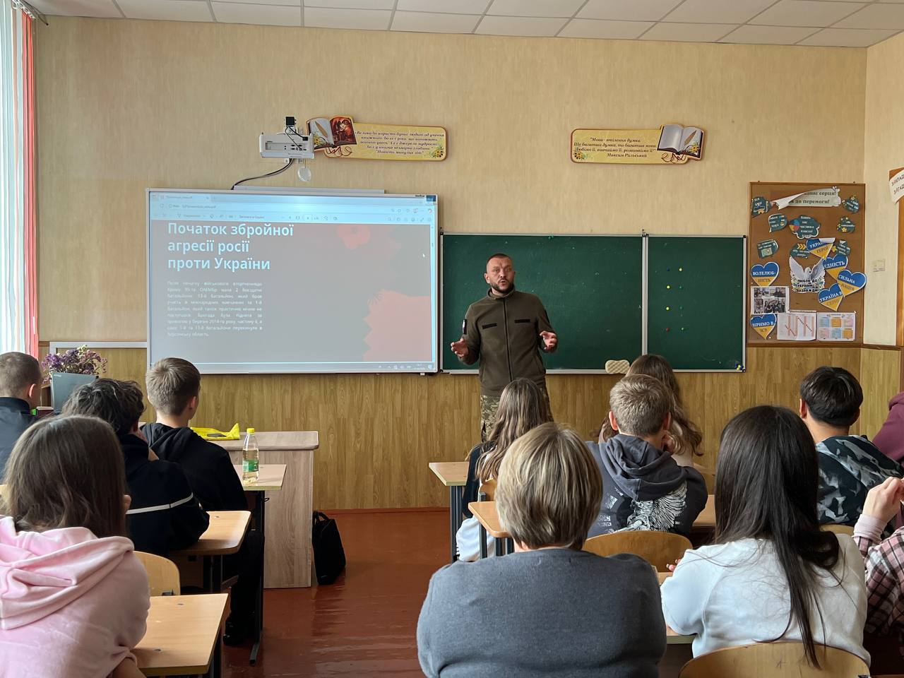 З перших хвилин у класі запанувала особлива атмосфера – гордість, захоплення та щира цікавість. Дітки підготувалися до події заздалегідь: прикрасили клас національними символами та зустріли нашого героя патріотичною піснею